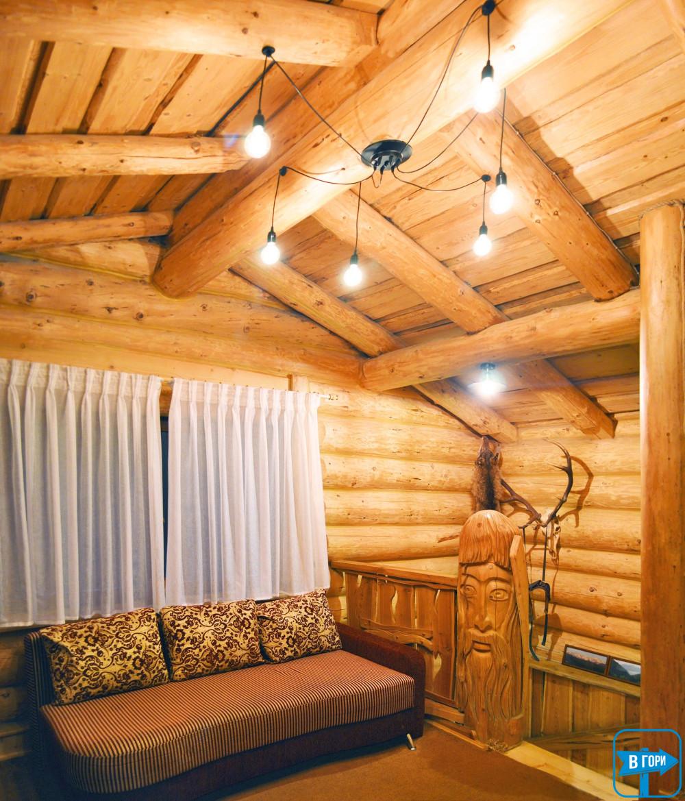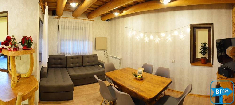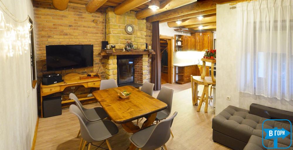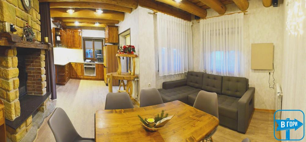 вітальня/кухня-студіо з каміном на дрова, стіл на 6 персон з кріслами, кутовий розкладний диван зі спальним місцем 160х200см., шафа для одягу, РК-телевізор 42″, кухонний куточок.