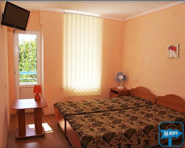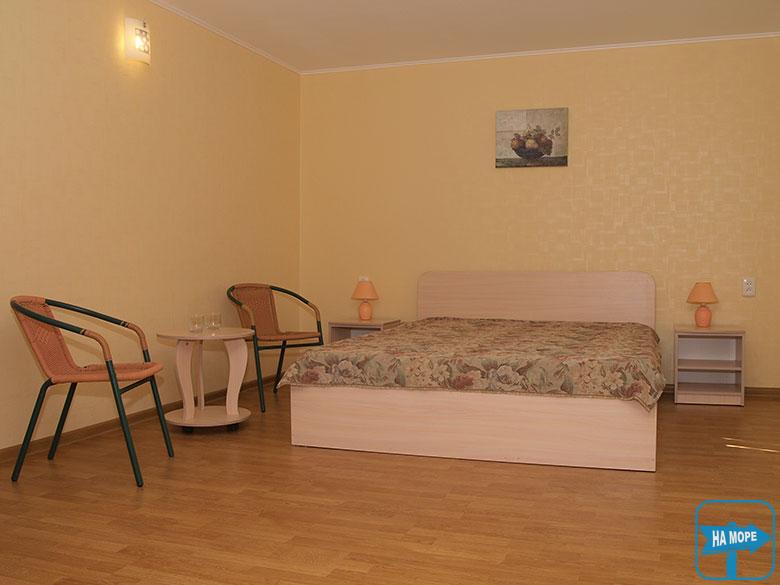 Будиночки біля моря: розраховані на проживання 4-5 осіб. У будиночках встановлені віконні кондиціонери, ліжка, тумбочки, є телевізор, холодильник, набір посуду. Також є санвузол з водонагрівачем, душем, туалетом та умивальником.