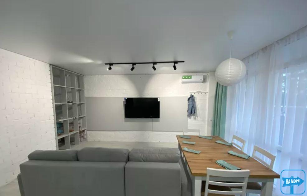Номер 60м2. Світлий, дуже затишний. У номері 2 двоспальні ліжка з ортопедичними матрацами, тумбочки, шафа купе, 2 розкладні дивани, обідній стіл і стільці. Кухня з усім необхідним посудом, індукційною плитою, духовка, посудомийна машина, великим холодильником, ел.чайником. У номері також є кондиціонер, холодильник, телевізор, пральна машинка. З окремим входом та власною великою терасою.