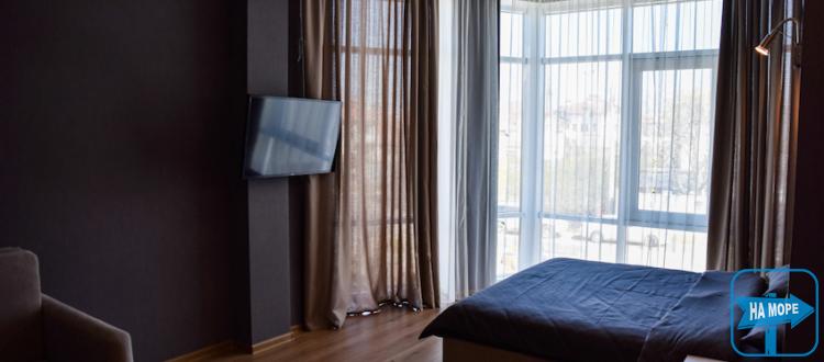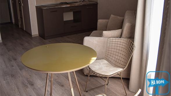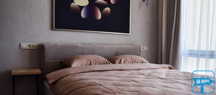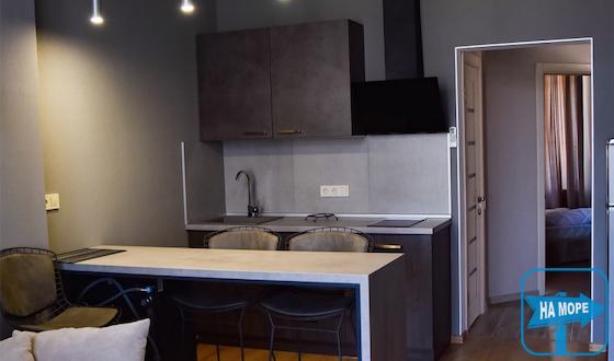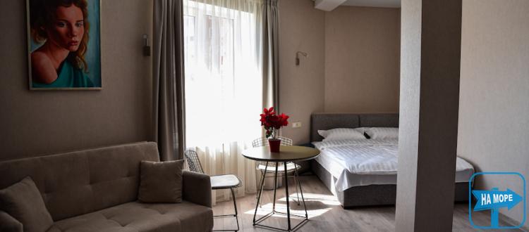 Номер категорії «Апартаменти зі спальнею» - Комфортабельні однокімнатні апартаменти з двома ліжками, своєю кухнею, кондиціонером, теплою підлогою, власним санвузлом, терасою, безкоштовним WiFi та за 500 метрів від моря.