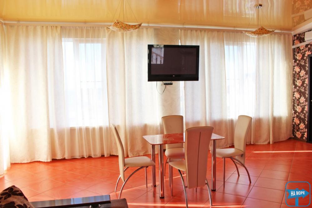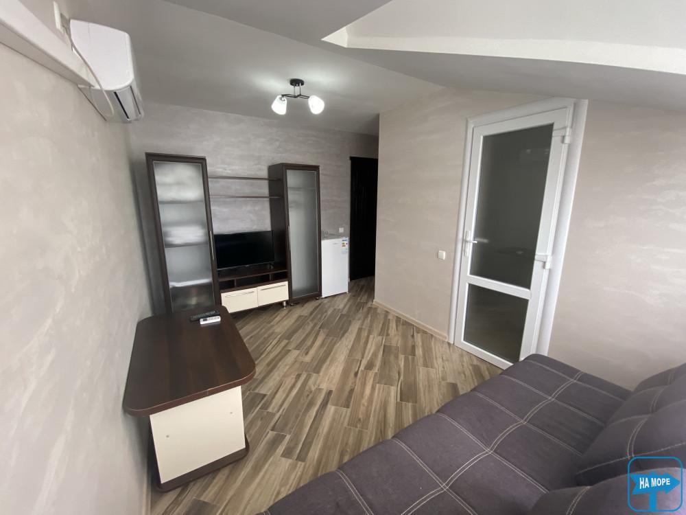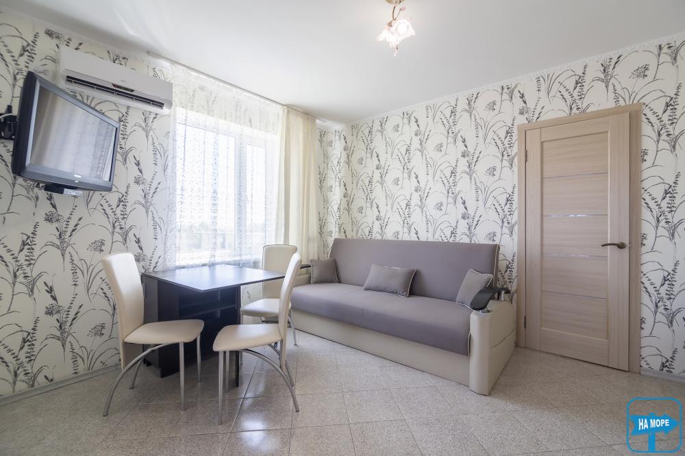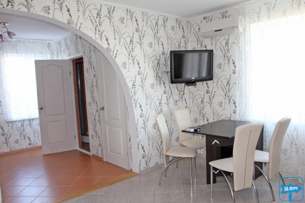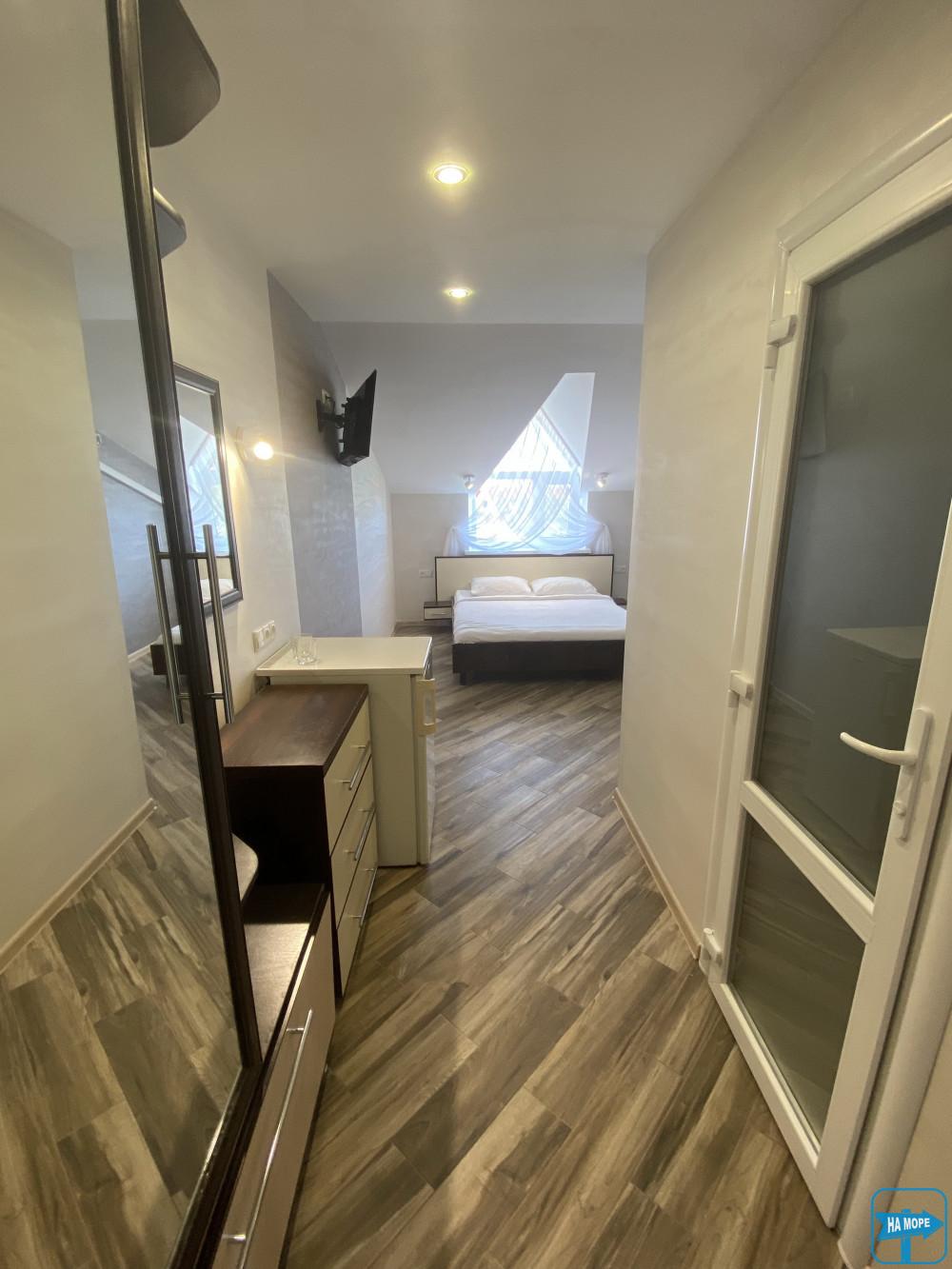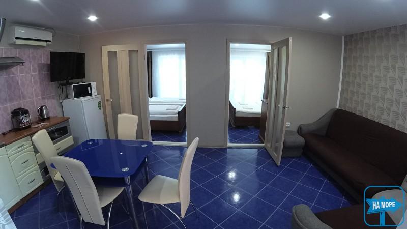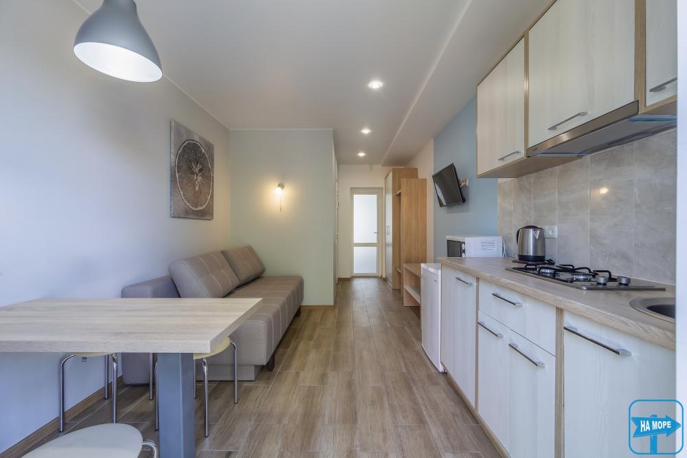 Апартамент з окремим входом розташований на 1 поверсі головного корпусу готелю. В апартаментах: • комфортне двоспальне ліжко зі зручним матрацом; • розкладний двоспальний диван; • кухня-студія (холодильник, плита, чайник, мікрохвильова піч, посуд); • власна ванна кімната з туалетом та душем; • безлімітний WiFi та супутникове ТБ, кондиціонер; • можливість організувати додаткове спальне місце за 250 грн. У низький сезон в вартість входить сніданок за системою шведський стіл на 4 особи.