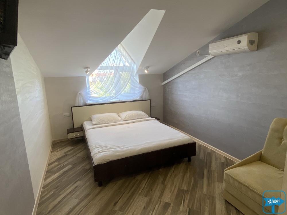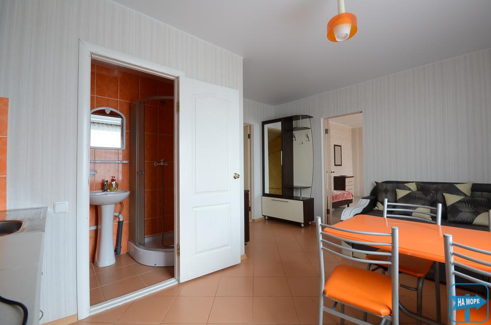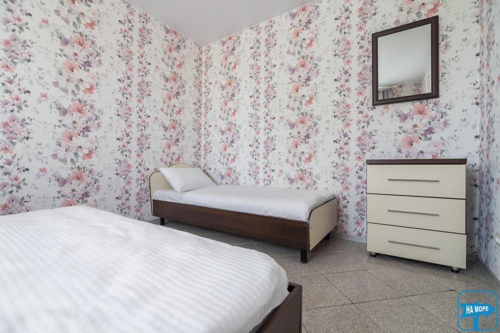 Апартаменти з однією спальнею розташовані на 2-му поверсі головного корпусу пансіонату. В апартаментах: • комфортне двоспальне ліжко зі зручним матрацом; односпальне рувати • розкладний двоспальний диван; • кухня-студія (холодильник, плита, чайник, мікрохвильова піч, посуд); • власна ванна кімната з туалетом та душем; • безлімітний WiFi та супутникове ТБ, кондиціонер; • У низький сезон у вартість входить сніданок на чотири гості. Є можливість організувати додаткове спальне місце за 250 грн.