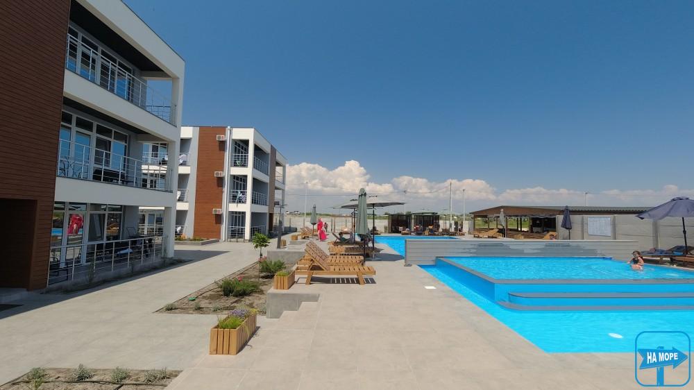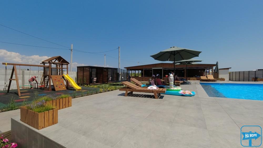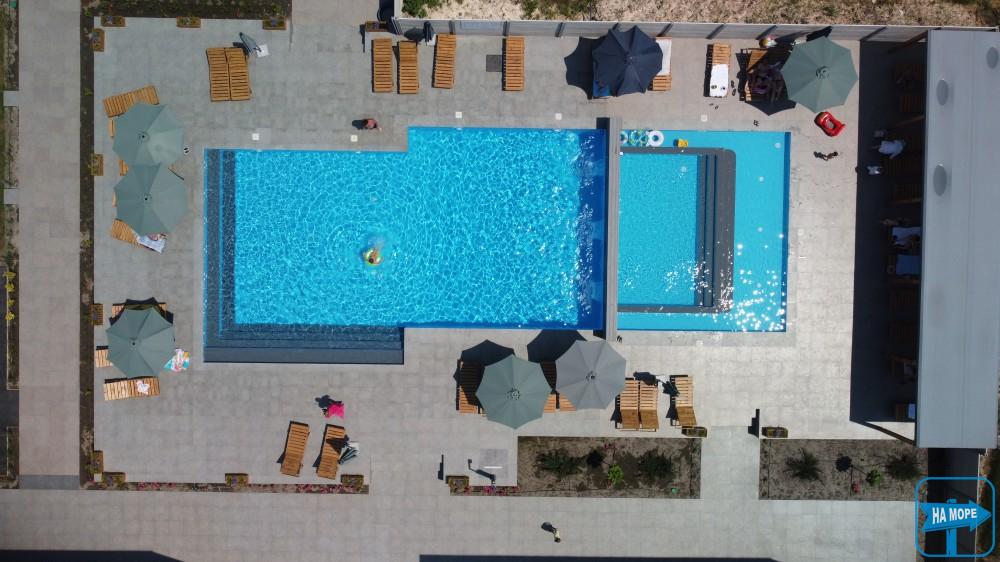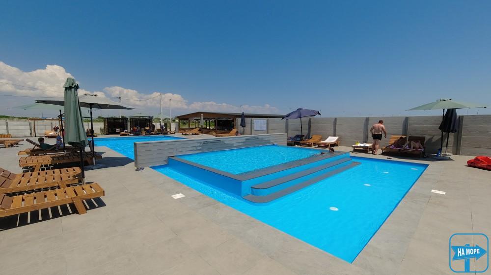 На території готелю розташований чудовий відкритий басейн, купатися в якому дуже приємно, тому що в ньому найчистіша артезіанська вода комфортної температури та оптимальна глибина 1,5 метра. По периметру басейну встановлені зонтики від сонця та зручні лежаки, комфортно розташувавшись на яких можна милуватися чудовим краєвидом. Басейн оснащений донними гейзерами, водоспадами із підсвічуванням, гідромасажем.