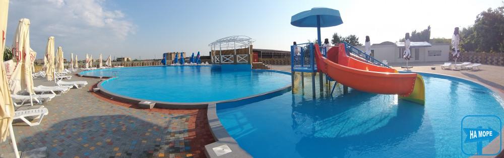 Пансіонат сімейного типу розташований на першій береговій лінії узбережжя Азовського моря (коса Арабатська Стрілка), а також у кроковій доступності до одних з основних лікувальних пам'яток цього регіону: гарячого Термального джерела та Солоного озера.