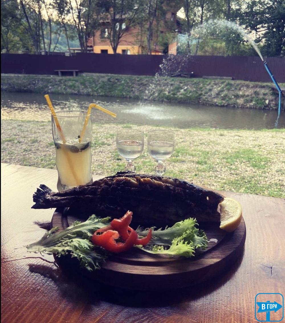 На території функціонує колиба на 50 місць, де вам запропонують не тільки приготувати виловлену рибу, а й повноцінне меню зі стравами європейської та карпатської кухні. Також тут є широкий асортимент напоїв та банкетне меню.