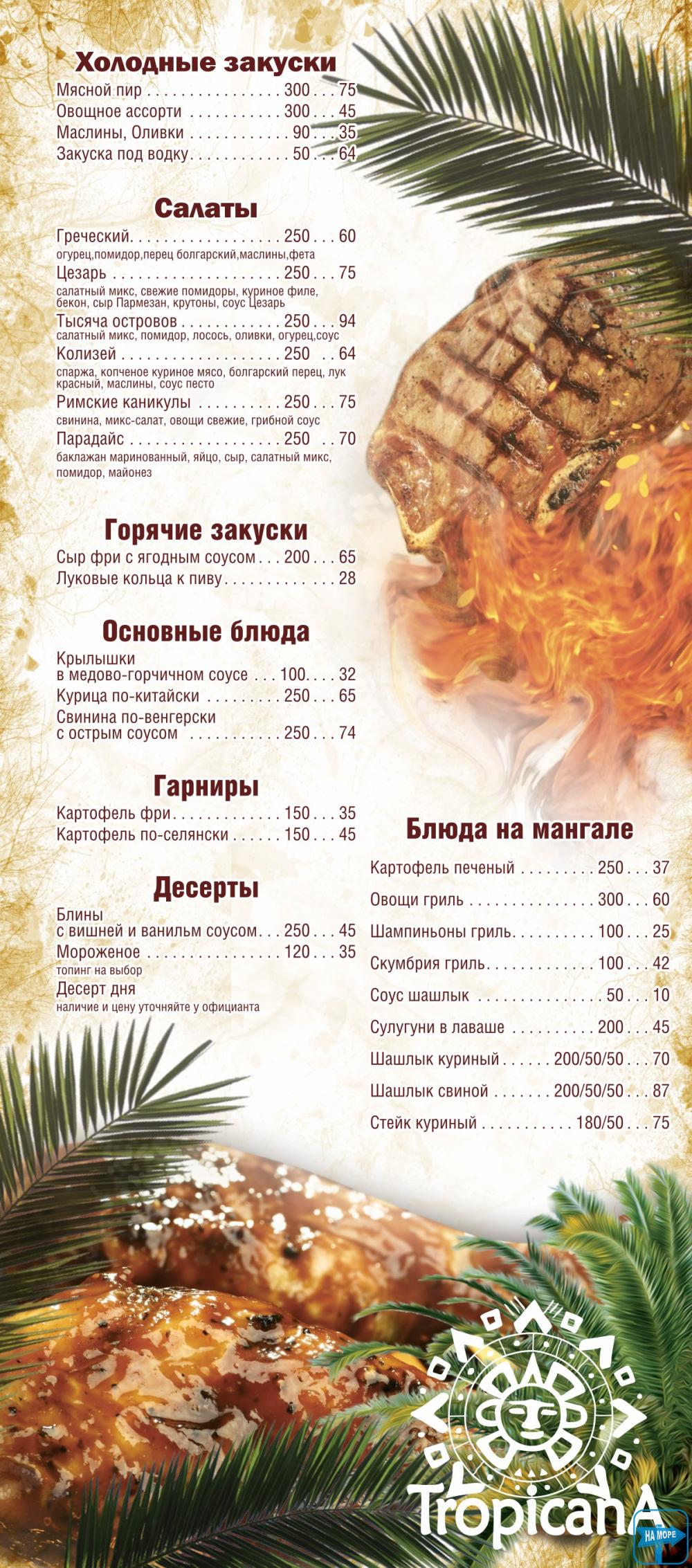 Tropicana – місце, де можна поїсти, випити та покурити кальян. Зовсім поряд із морем. Тут комплексні сніданки, обіди та вечері. Знижки, акції та гарний настрій. Увечері жива музика та ще ширше меню. Зовсім поруч VIP-готель та економ-готель Куба, кафе «У Ксюші», готель Міленіум. Це приблизно середина Курортного проспекту з/відпочинку Коблево. Смачного!